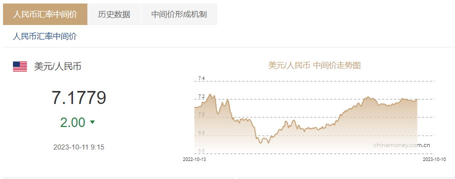 10月11日消息 中国外汇交易中心显示,11日,人民币对美元中间价报7.1779,调升2个基点。