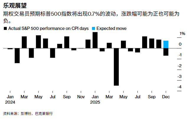 由于人工智能相关股票的疲软抵消了投资者对美联储可能进一步降息的乐观情绪,美国股市连续第四个交易日下跌。标普500指数周三下跌1.2%,创下一个月来最长连跌纪录。交易员们正在密切关注美联储的下一步动向,今晚关键通胀数据以及每周初请失业金人数,将为美联储的潜在利率路径提供线索。由于市场预期CPI年率持稳在3%,若符合预期则可能对美股的波动影响有限。根据巴克莱银行汇编的数据,期权交易员押注标普500指数在通胀报告公布后将出现0.7%的波动。