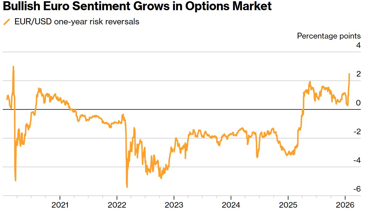 期权市场对欧元的看涨情绪持续高涨。本周,相较于看跌,针对未来一年欧元兑美元上涨进行套期保值或投机的溢价已升至2020年3月以来的最高水平。
